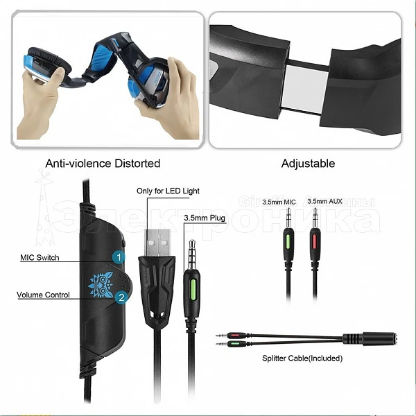 Характеристики: Диаметр динамика: 50 мм Сопротивление: 32 Ом; Чувствительность: 114dB, S.P.L. на 1 кГц; Частотный диапазон: 20 Гц-20,000 Гц; Подсветка динамиков Регулировка громкости Вкл/выкл микрофона Длина шнура: 2.2м; Разъем: 3.5мм / USB (в комплекте переходник на два штекера 3.5мм)