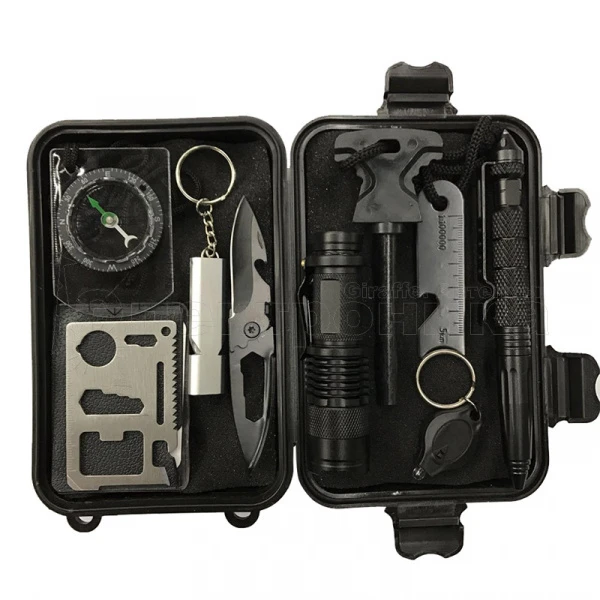 В набор входит: 1) Инструмент карта 2) Фонарик (3 режима, питание АА-в комплект не входит) 3) Фонарик 4) Кремень 5) Свисток 6) Компас 7) Тактическая ручка 8) Нож Размер кейса: 16 х 10 х 5 см