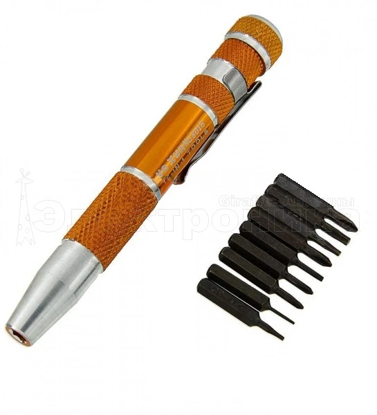 Набор отверток YX-8015, Набор из отвертки держателя и 9 сменных насадок. Отвертка имеет специальную клипсу для крепления отвертки на кармане одежды или кейса с инструментами. Внутренняя емкость-пенал может вместит до 12 насадок. Включает в себя следующие насадки: Насадка с шестигранным шлицом (жалом) – T4; T5; T6; T7 Насадка с крестовым шлицом (жалом) – 2.0; 3.0 мм Насадка с плоским шлицом (жалом) – 1,5 мм Насадка с трехлучевым шлицом (жалом) – Y2.0 Насадка пятиконечная звезда – 2.0