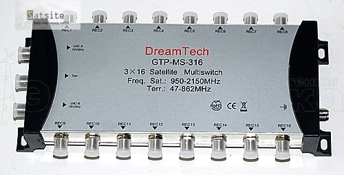Мультисвитч - это специальный переключатель, который позволяет подключать несколько ресиверов к одной тарелке так, что все ресиверы будут работать независимо друг от друга, т.е. смогут выбирать нужную поляризацию. Также некоторые мультисвитчи имеют разъем для подключения обычной телевизионной антенны, т.е. с помощью диплексора вы можете в квартире разветвить полученный с крыши сигнал на простой телевизионный и спутниковый. Для НТВ+, Триколор, Ямал, Экспресс, 3*12, 3 входа, 1 эфирный, 2 спутниковых, 16-ть независимых выходов, комплектуется сетевым БП Мультисвитчер DreamTech GTP-MS-316 PS отличие GTP-MS-316 - только наличие встроенного блока питания у GTP-MS-316 PS 2*SAT/1*TV вход, 16 независимых выходов, SAT+TV 47..862/950..2150МГц Характеристики: НАЗНАЧЕНИЕ GTP-MS-316 Тип: Мультисвитч SAT входов: 2; ТВ вход: 1; Количество независимых выходов: 16; Частотный диапазон: 47..862/ 950..2150 МГц; Питание: от внешнего блока питания Другие наименования модели: DreamTech GTP MS 316 PS