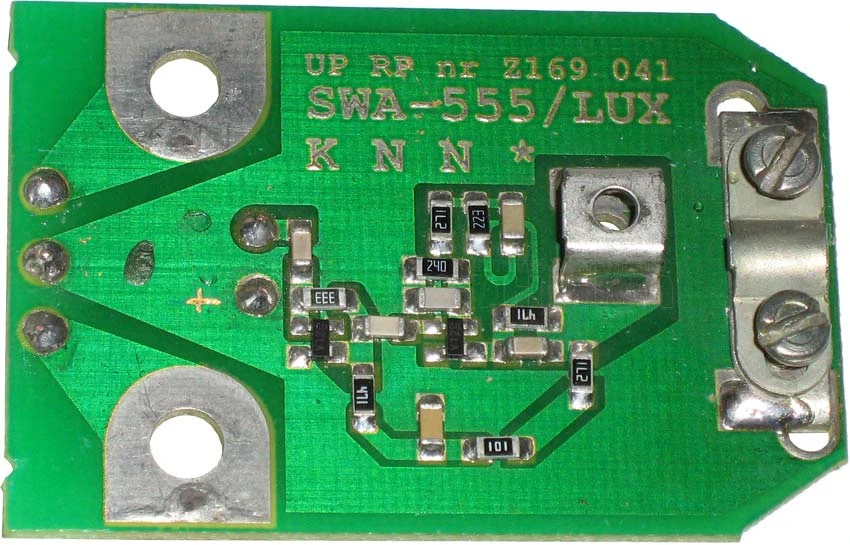 Усилитель SWA-555 представляет собой двухкаскадный апериодический усилитель ВЧ на биполярных микротранзисторах Т67 (BFG-67) или BFR-91A. Первый каскад — широкополосный, без коррекции. Во втором каскаде имеется коррекция: конденсатор С5 в цепи токовой ООС транзистора VT2 обеспечивает спад АЧХ на нижних частотах рабочего диапазона, а конденсатор С4 в цепи ООС по напряжению ограничивает усиление на верхних частотах и за пределами рабочей полосы. АЧХ усилителя показана на рис. 2. В целом схемы усилителей SWA-555 и SWA-9 практически полностью совпадают (у первого лишь отсутствует LC-фильтр в цепи питания и изменены некоторые номиналы пассивных элементов). Поэтому и АЧХ усилителей близки. Однако при использовании в первом каскаде малошумящего транзистора BFR-91A (Кш =1,6 дБ) усилитель SWA-555 имеет меньший коэффициент шума.